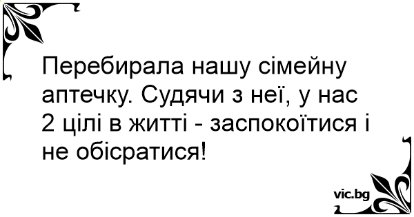 Перебирала нашу сімейну аптечку. Судячи з неї, у нас 2 цілі в житті - заспокоїтися і не обісратися!
