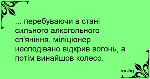 ... перебуваючи в стані сильного алкогольного сп'яніння, міліціонер несподівано відкрив вогонь, а потім винайшов колесо.