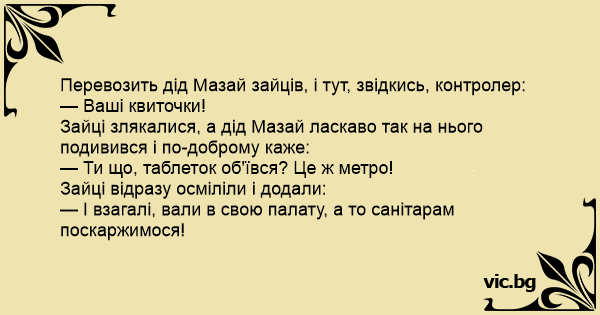 Перевозить дід Мазай зайців, і тут, звідкись, контролер: