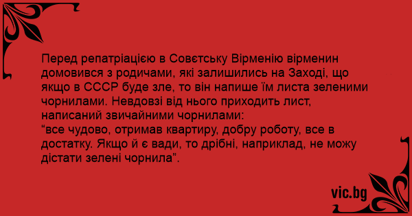 Перед репатріацією в Совєтську Вірменію вірменин домовився з родичами, які залишились на Заході, що якщо в СССР буде зле, то він напише їм листа зеленими чорнилами. Невдовзі від нього приходить лист, написаний звичайними чорнилами: