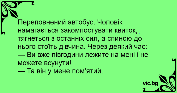 Переповнений автобус. Чоловік намагається закомпостувати квиток, тягнеться з останніх сил, а спиною до нього стоїть дівчина. Через деякий час:
