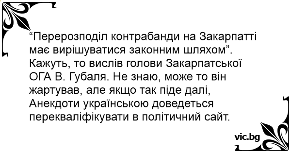 “Перерозподіл контрабанди на Закарпатті має вирішуватися законним шляхом”. Кажуть, то вислів голови Закарпатської ОГА В. Губаля. Не знаю, може то він жартував, але якщо так піде далі, Анекдоти українською доведеться перекваліфікувати в політичний сайт.
