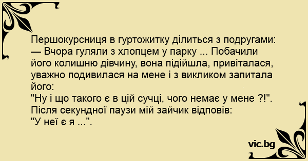 — Вчора гуляли з хлопцем у парку ... Побачили його колишню дівчину, вона підійшла, привіталася, уважно подивилася на мене і з викликом запитала його:
