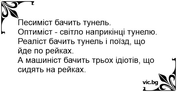 A pesszimista a sötétséget látja az alagútban, az optimista a fényt az Alagút végén, a realista a közelgő vonat lámpáit, a mozdonyvezető pedig Három idiótát a síneken.