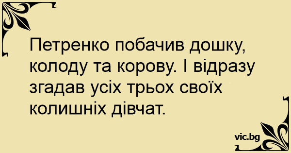 Петренко побачив дошку, колоду та корову. І відразу згадав усіх трьох своїх колишніх дівчат.