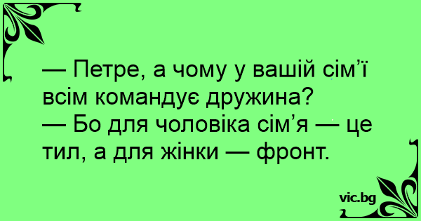 — Петре, а чому у вашій сім’ї всім командує дружина?