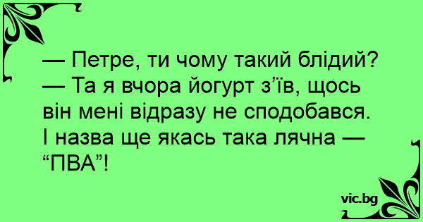 — Та я вчора йогурт з’їв, щось він мені відразу не сподобався. І назва ще якась така лячна — “ПВА”!