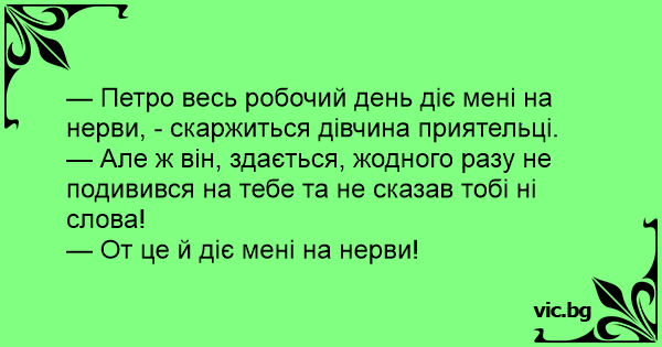 — Петро весь робочий день діє мені на нерви, - скаржиться дівчина приятельці.