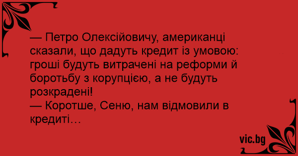 — Петро Олексійовичу, американці сказали, що дадуть кредит із умовою: гроші будуть витрачені на реформи й боротьбу з корупцією, а не будуть розкрадені!