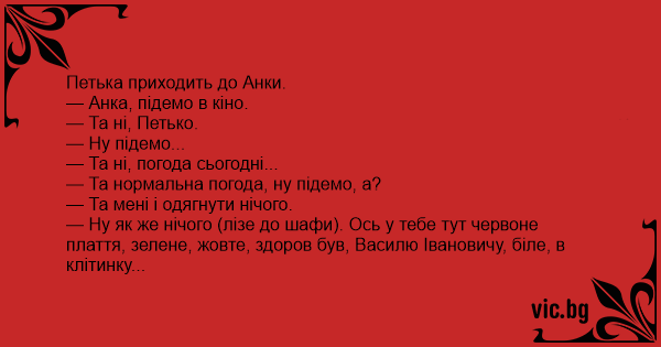 — Ну як же нічого (лізе до шафи). Ось у тебе тут червоне плаття, зелене, жовте, здоров був, Василю Івановичу, біле, в клітинку...