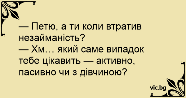 — Хм… який саме випадок тебе цікавить — активно, пасивно чи з дівчиною?