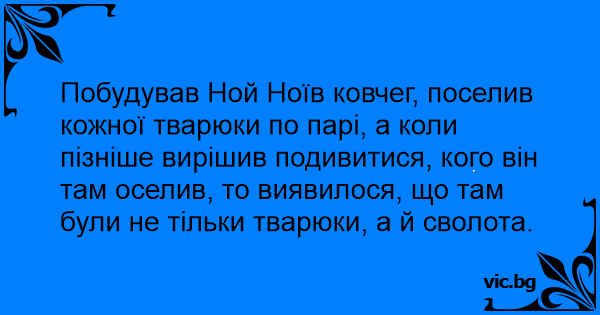 Побудував Ной Ноїв ковчег, поселив кожної тварюки по парі, а коли пізніше вирішив подивитися, кого він там оселив, то виявилося, що там були не тільки тварюки, а й сволота.