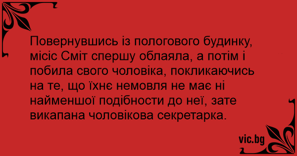 Повернувшись із пологового будинку, місіс Сміт спершу облаяла, а потім і побила свого чоловіка, покликаючись на те, що їхнє немовля не має ні найменшої подібности до неї, зате викапана чоловікова секретарка.