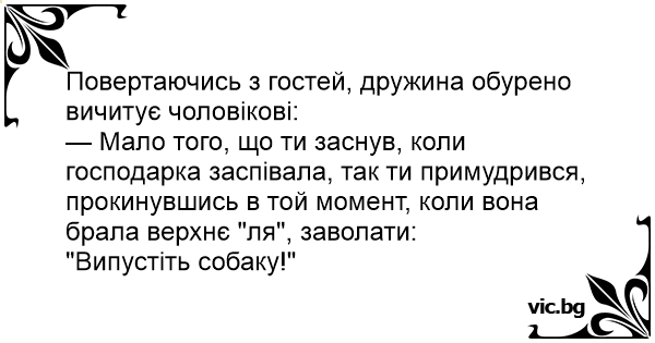 — Мало того, що ти заснув, коли господарка заспівала, так ти примудрився, прокинувшись в той момент, коли вона брала верхнє "ля", заволати: