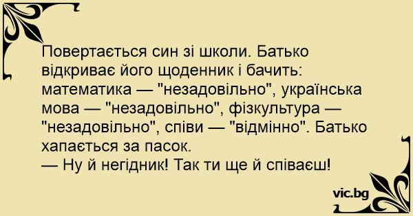Повертається син зі школи. Батько відкриває його щоденник і бачить: математика — "незадовільно", українська мова — "незадовільно", фізкультура — "незадовільно", співи — "відмінно". Батько хапається за пасок.