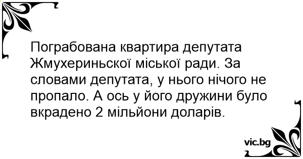 Пограбована квартира депутата Жмухериньскої міської ради. За словами депутата, у нього нічого не пропало. А ось у його дружини було вкрадено 2 мільйони доларів.