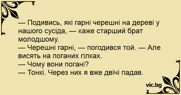 — Черешні гарні, — погодився той. — Але висять на поганих гілках.