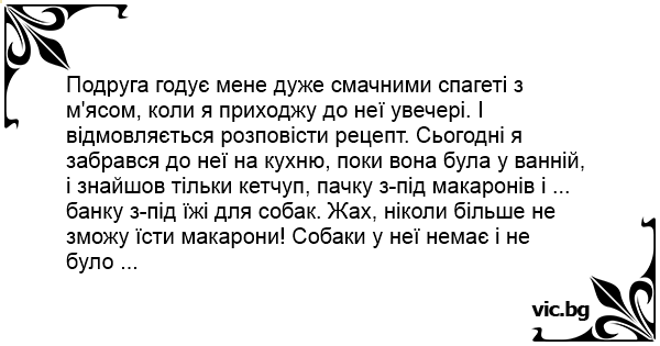 Подруга годує мене дуже смачними спагеті з м'ясом, коли я приходжу до неї увечері. І відмовляється розповісти рецепт. Сьогодні я забрався до неї на кухню, поки вона була у ванній, і знайшов тільки кетчуп, пачку з-під макаронів і ... банку з-під їжі для собак. Жах, ніколи більше не зможу їсти макарони! Собаки у неї немає і не було ...