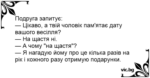 Подруга запитує: — Цікаво, а твій чоловік пам'ятає дату вашого весілля? — На щастя ні. — А чому "на щастя"? — Я нагадую йому про це кілька разів на рік і кожного разу отримую подарунки.