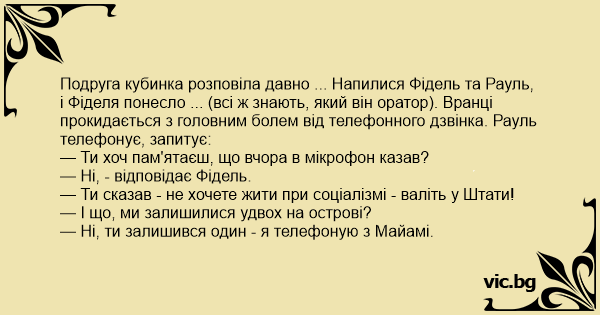 Подруга кубинка розповіла давно ... Напилися Фідель та Рауль, і Фіделя понесло ... (всі ж знають, який він оратор). Вранці прокидається з головним болем від телефонного дзвінка. Рауль телефонує, запитує: