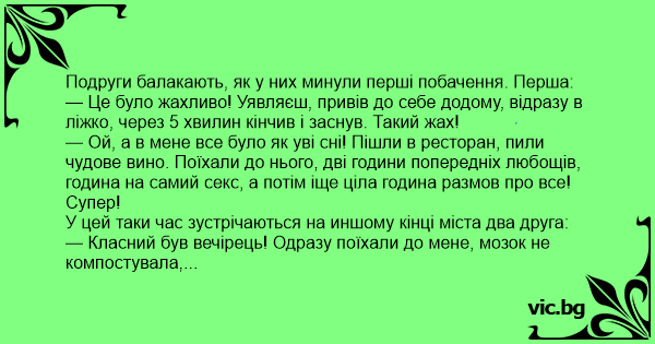 — Ой, а в мене все було як уві сні! Пішли в ресторан, пили чудове вино. Поїхали до нього, дві години попередніх любощів, година на самий cekc, а потім іще ціла година размов про все! Супер!