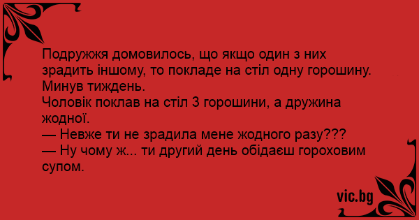 Подружжя домовилось, що якщо один з них зрадить іншому, то покладе на стіл одну горошину.