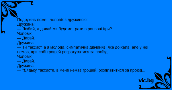 Подружнє ложе - чоловік з дружиною: Дружина: — Любий, а давай ми будемо грати в рольові ігри? Чоловік: — Давай. Дружина: — Ти таксист, а я молода, симпатична дівчинка, яка доїхала, але у неї немає, при собі грошей розрахуватися за проїзд. Чоловік: — Давай. Дружина: — "Дядьку таксисте, в мене немає грошей, розплатитися за проїзд відпустіть мене, будь ласка?" Чоловік: — Іди ...
