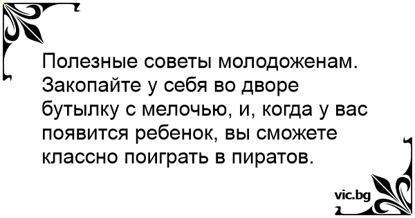 Полезные советы молодоженам. Закопайте у себя во дворе бутылку с мелочью, и, когда у вас появится ребенок, вы сможете классно поиграть в пиратов.