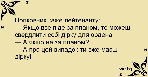 — Якщо все піде за планом, то можеш свердлити собі дірку для ордена!