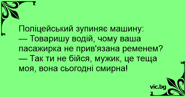 — Так ти не бійся, мужик, це теща моя, вона сьогодні смирна!