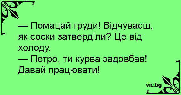 — Петро, ти kуpba задовбав! Давай працювати!