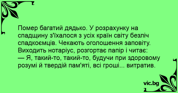 Помер багатий дядько. У розрахунку на спадщину з'їхалося з усіх країн світу безліч спадкоємців. Чекають оголошення заповіту. Виходить нотаріус, розгортає папір і читає: