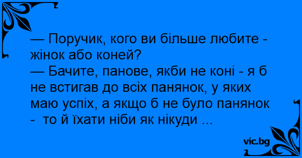 — Бачите, панове, якби не коні - я б не встигав до всіх панянок, у яких маю успіх, а якщо б не було панянок - то й їхати ніби як нікуди ...