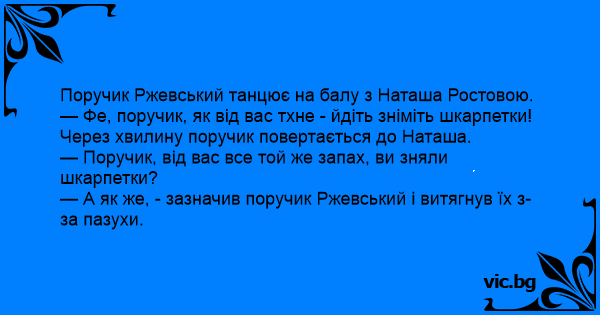 — Поручик, від вас все той же запах, ви зняли шкарпетки?