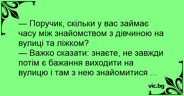 — Поручик, скільки у вас займає часу між знайомством з дівчиною на вулиці та ліжком?