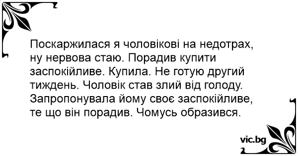 Поскаржилася я чоловікові на недотрах, ну нервова стаю. Порадив купити заспокійливе. Купила. Не готую другий тиждень. Чоловік став злий від голоду. Запропонувала йому своє заспокійливе, те що він порадив. Чомусь образився.