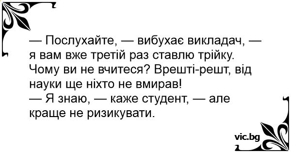 — Послухайте, — вибухає викладач, — я вам вже третій раз ставлю трійку. Чому ви не вчитеся? Врешті-решт, від науки ще ніхто не вмирав!
