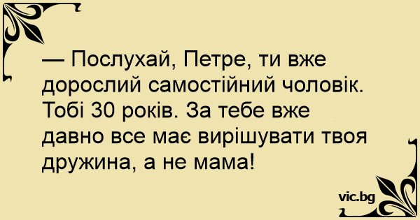 — Послухай, Петре, ти вже дорослий самостійний чоловік. Тобі 30 років. За тебе вже давно все має вирішувати твоя дружина, а не мама!