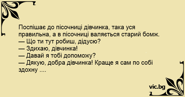 Поспішає до пісочниці дівчинка, така уся правильна, а в пісочниці валяється старий бомж.
