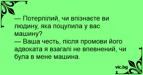 - Cietušais, vai jūs atpazīstat apsūdzētajā jūsu auto zagli? - Ziniet, pēc viņa advokāta runas es vispār sāku šaubīties, vai man ir bijis auto...