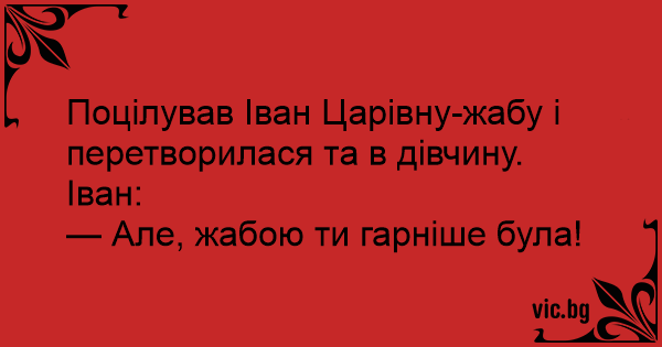 Поцілував Іван Царівну-жабу і перетворилася та в дівчину. Іван: