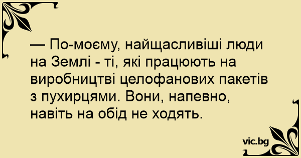 — По-моєму, найщасливіші люди на Землі - ті, які працюють на виробництві целофанових пакетів з пухирцями. Вони, напевно, навіть на обід не ходять.