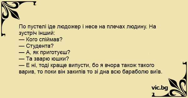 По пустелі іде людожер і несе на плечах людину. На зустріч інший: