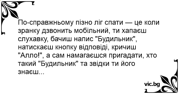 По-справжньому пізно ліг спати — це коли зранку дзвонить мобільний, ти хапаєш слухавку, бачиш напис "Будильник", натискаєш кнопку відповіді, кричиш "Алло!", а сам намагаєшся пригадати, хто такий "Будильник" та звідки ти його знаєш...