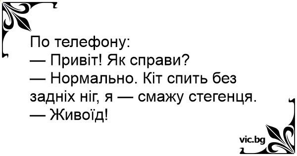 — Нормально. Кіт спить без задніх ніг, я — смажу стегенця.