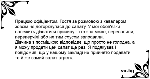 Працюю офіціантом. Гостя за розмовою з кавалером зовсім не доторкнулася до салату. У мої обов'язки належить дізнатися причину - хто зна може, пересолили, переперчілі або не тим соусом заправили.