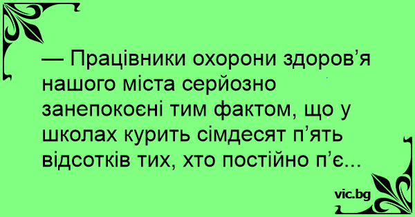 — Працівники охорони здоров’я нашого міста серйозно занепокоєні тим фактом, що у школах курить сімдесят п’ять відсотків тих, хто постійно п’є...