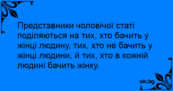 Представники чоловічої статі поділяються на тих, хто бачить у жінці людину, тих, хто не бачить у жінці людини, й тих, хто в кожній людині бачить жінку.
