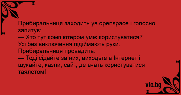 Усі без виключення підіймають руки. Прибиральниця провадить: