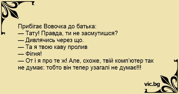 — От і я про те ж! Але, схоже, твій комп’ютер так не думає: тобто він тепер узагалі не думає!!!